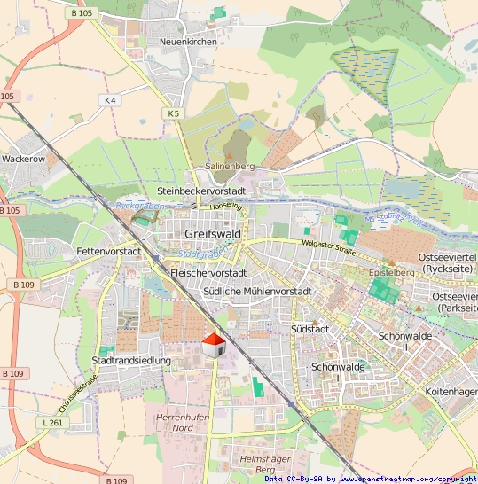 Das Wohnhaus befindet sich in der Gützkower Landstraße. In unmittelbarer Nähe befinden sich eine Busanbindung sowie verschiedene Einkaufsmöglichkeiten, wie ein Frischemarkt "Lidl", ein Baumarkt "toom", ein Getränkemarkt, ein China-Restaurant und eine Tankstelle. Das Stadtzentrum ist in wenigen Minuten mit dem Fahrrad erreichbar.