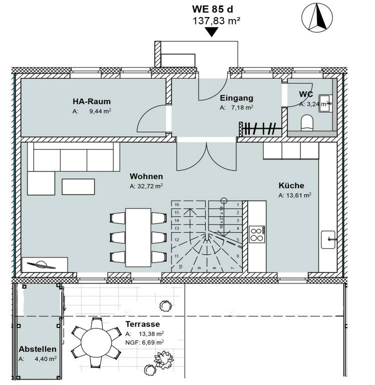 • Abstellraum außen, neben der Terrasse, für Gartenmöbel usw.; dient gleichzeitig als Sichtschutz