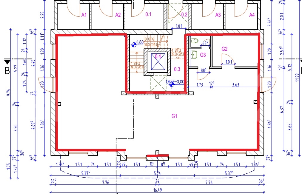 Im Erdgeschoss des neugebauten Gebäude befindet sich die Gewerbefläche. Es besteht die Möglichkeit der Trennung in 2 Einheiten von jeweils 57,64 m².