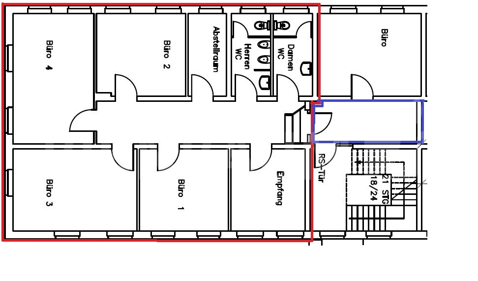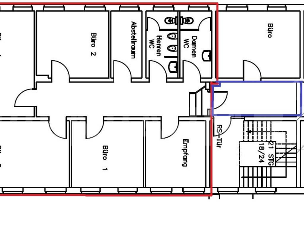 Alle Räume der Immobilie sind tagesbelichtet (Ost- und Westausrichtung). Der im Grundriss blau markierte Vorflur wird gemeinschaftlich mit der angrenzenden Gewerbeeinheit genutzt.