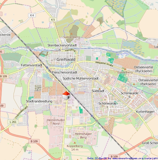 Das Wohnhaus befindet sich in der Gützkower Landstraße. In unmittelbarer Nähe befinden sich eine Busanbindung sowie verschiedene Einkaufsmöglichkeiten, wie ein Frischemarkt "Lidl", ein Baumarkt "toom", ein Getränkemarkt, ein China-Restaurant und eine Tankstelle.