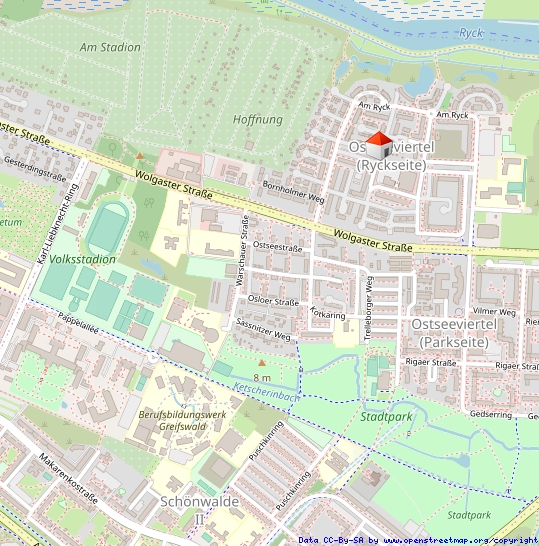 Das Gebiet liegt in direkter Nähe zum Flüsschen Ryck mit dem Treidelpfad, der eine Verbindung zwischen der Greifswalder Altstadt und den Ortsteilen Wieck und Eldena herstellt.