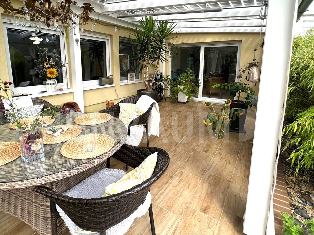 • Terrassenüberdachungen aus Holz mit Farbanstrich; Glasdächer mit innenliegenden Photovoltaikmodulen; die Seitenteile der Terrassen sind sehr hochwertig und solide als verschließbare Fensterplanen ausgeführt; elektrische Decken-Heizstrahler